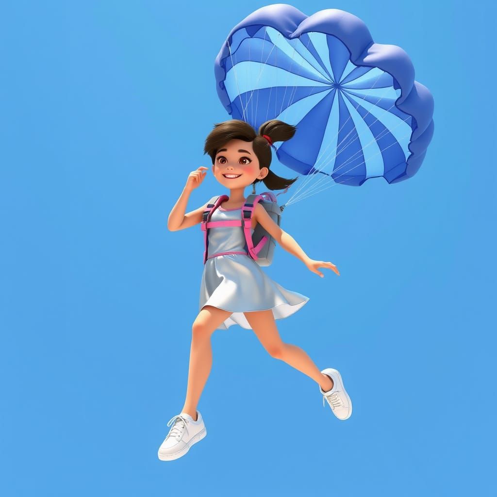 This image shows a 12-year-old girl named Belle wearing a silver outfit and pink parachute harness. She soars through a bright blue sky with a striped parachute, rendered as vibrant 3D digital art.