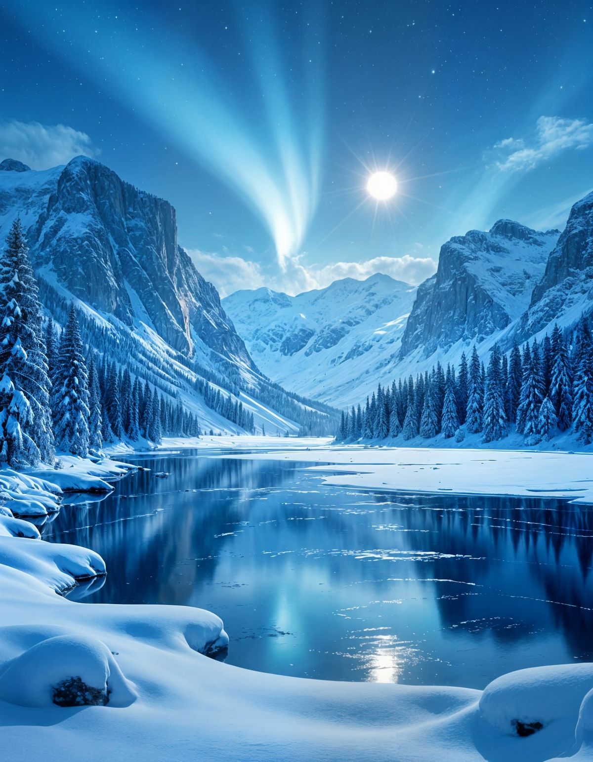 This image showcases an epic and ultra-realistic depiction of a winter landscape, capturing the grandeur and beauty of a snow-covered world in stunning detail.