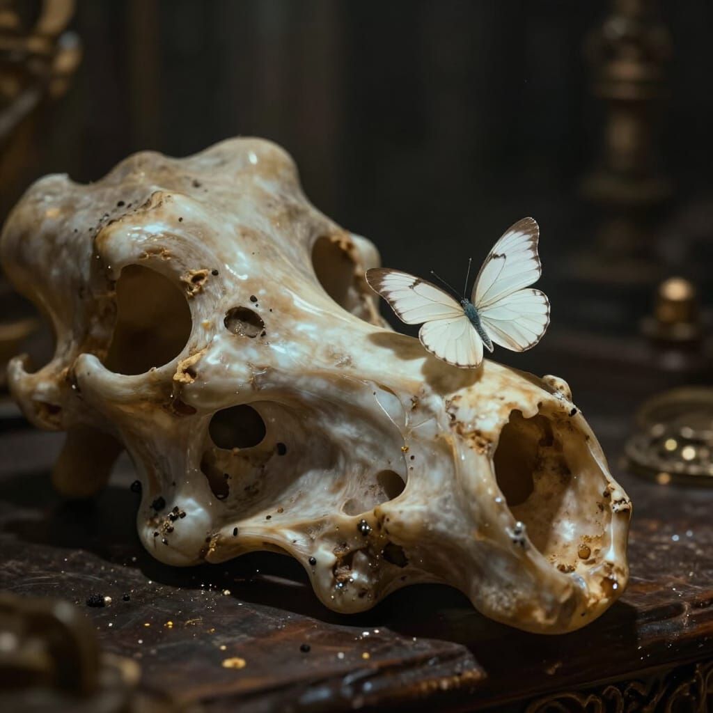 This image showcases an ultra-detailed macro photograph of an altar made from polished, imperfect bone-like textures. Dramatic lighting highlights intricate details, with a white butterfly adding a delicate touch. The scene evokes an ancient, emotional ambiance, rendered with deep colors and a splash scr...
