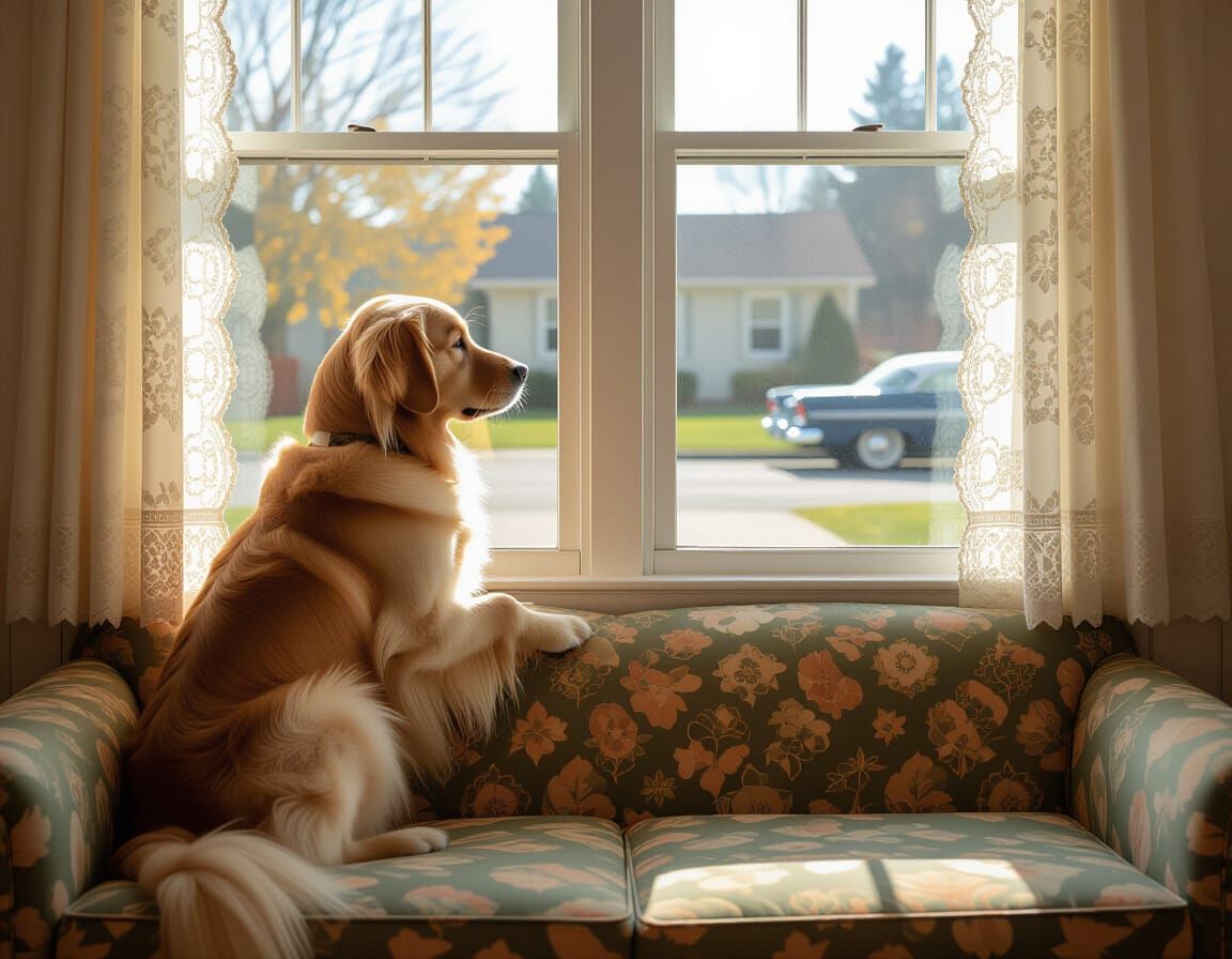 This image shows a Golden Retriever patiently waiting at a window, bathed in afternoon sunlight. The scene evokes a nostalgic, heartwarming mood, with vintage details like a 1950s sofa and mid-century car.