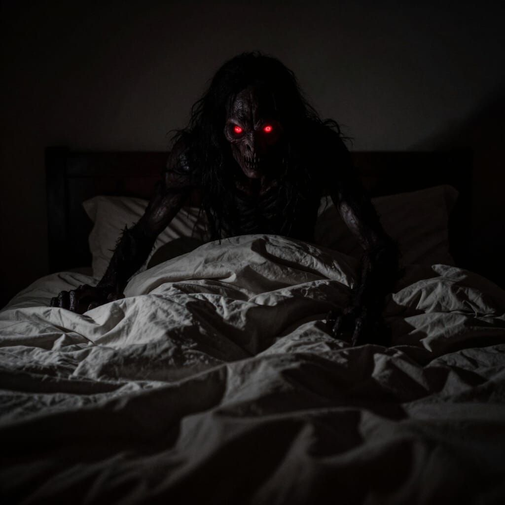 This image shows a shadowy monster with glowing red eyes from beneath a blanket. Rendered with dramatic lighting and deep shadows for an oppressive feel.