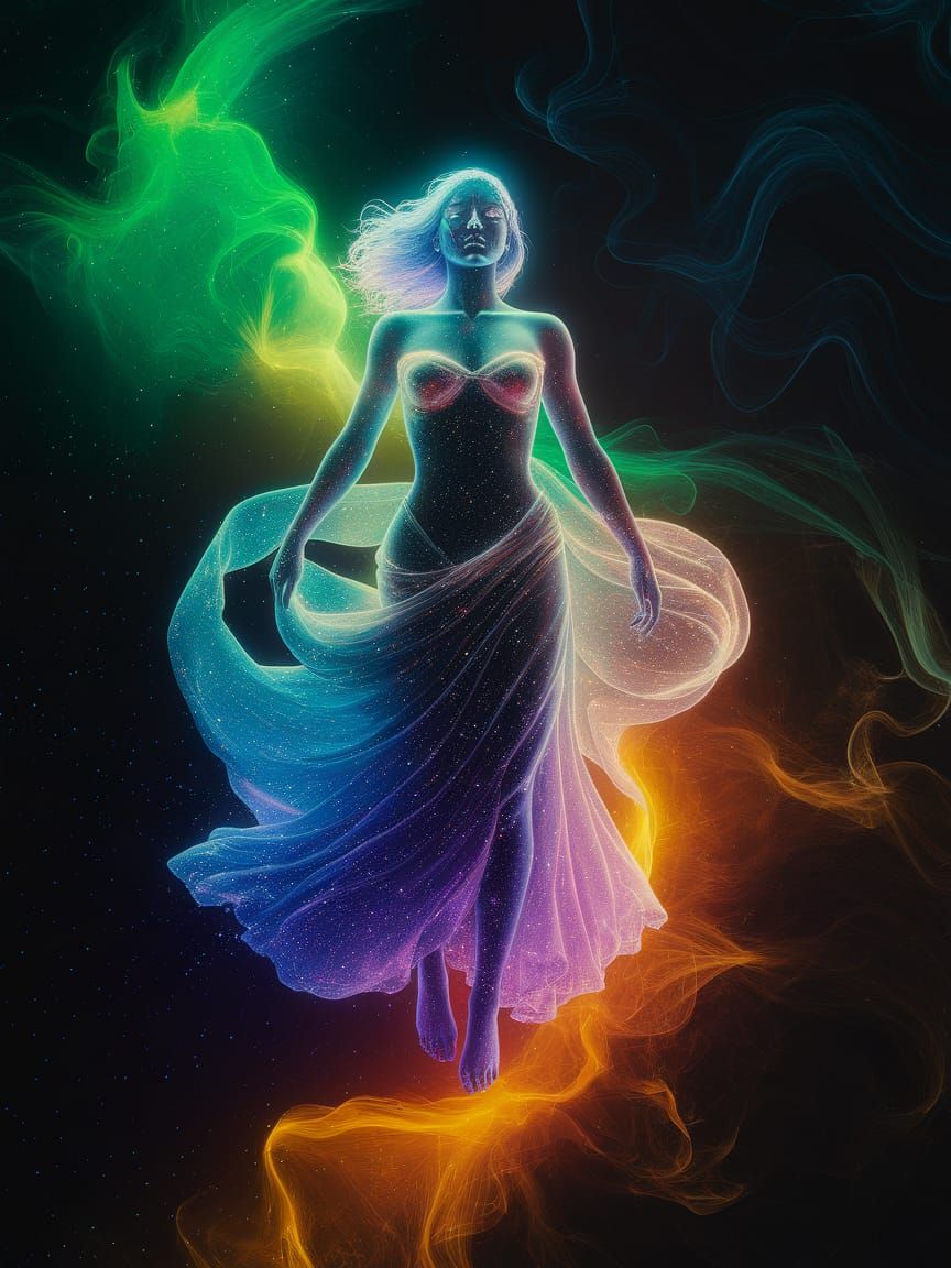 A digital art piece shows a glowing space goddess floating in a nebula of green and orange. Her robes are cosmic energy, surrounded by UV-reactive colors dissolving into black smoke. The artwork is vividly illuminated.