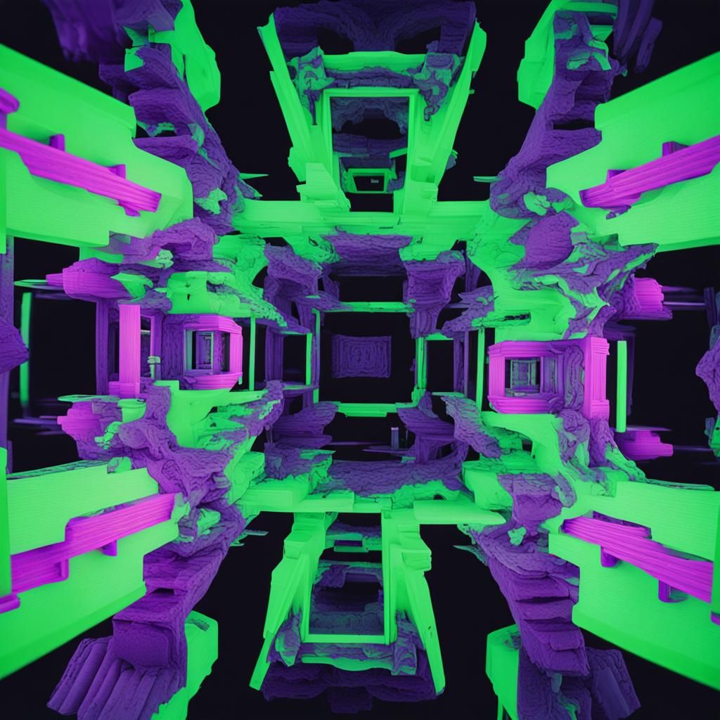 This image shows an intricate design with vibrant green and purple hues. The energetic composition features neon lighting and distortion, reminiscent of lomography film photography.