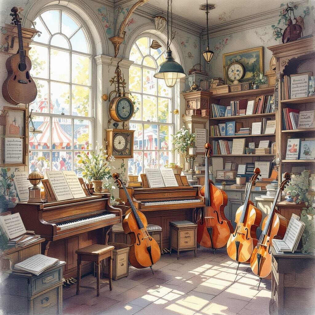 A charming watercolor painting of a vintage music shop within a lively carnival. Sunlight streams through the windows, highlighting antique instruments in gentle, whimsical colors. The image evokes classic storybook illustrations.
