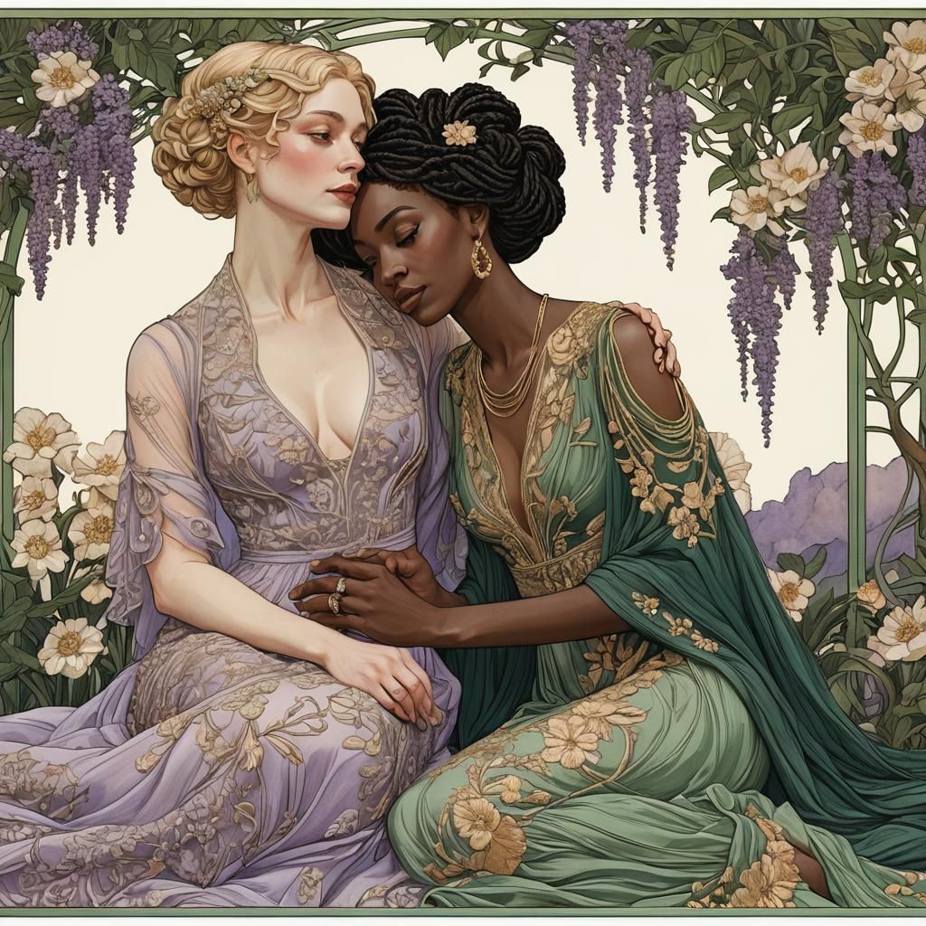 This image shows a mixed lesbian couple in a lush garden setting. The women are dressed in detailed attire, sitting closely together amidst cascading wisteria and warm, natural light. The artwork has soft, painterly textures.