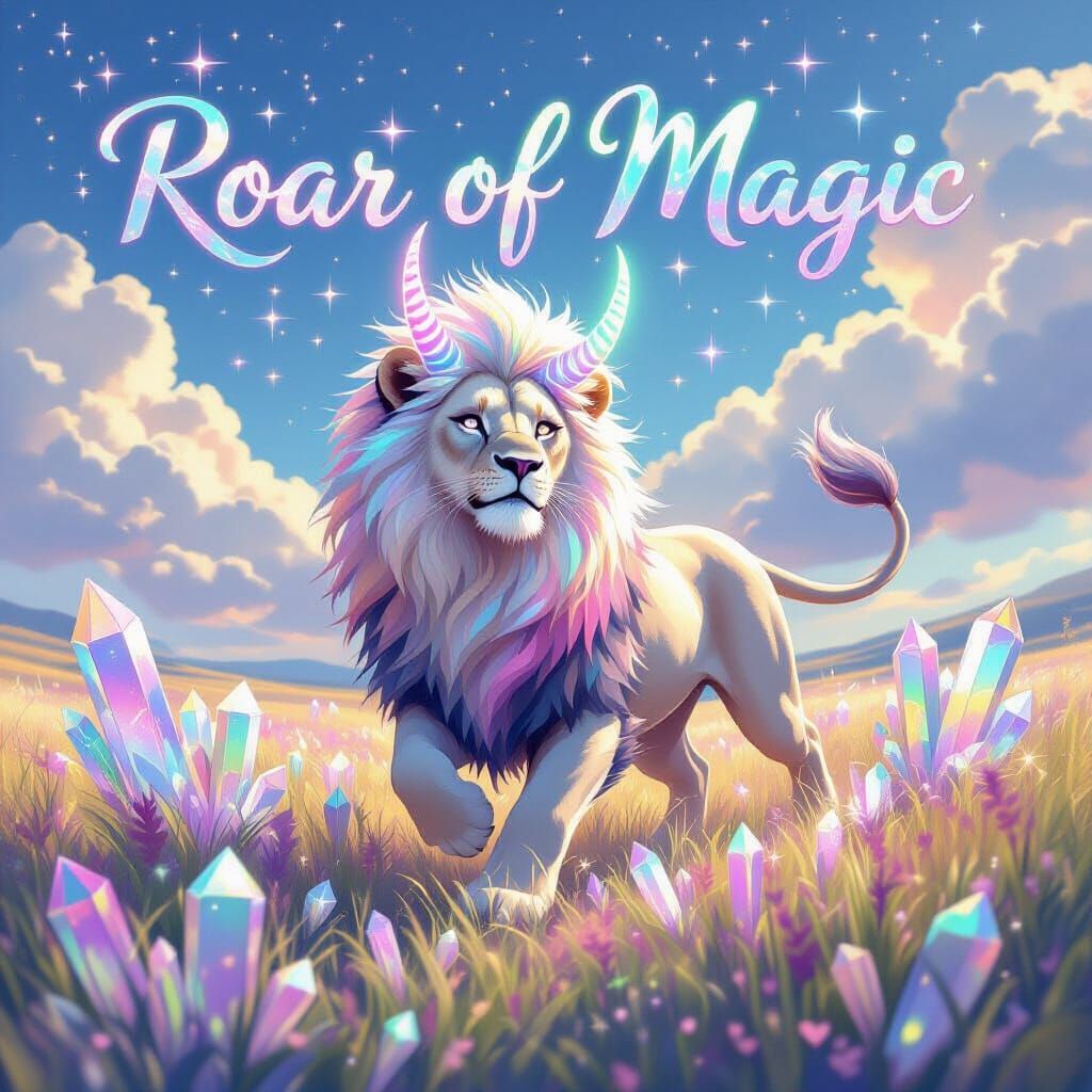 This image depicts a pastel lion in a crystal field. The magical scene includes a flowing mane and tail, sparkling eyes, a horn emitting light, and holographic cursive text.
