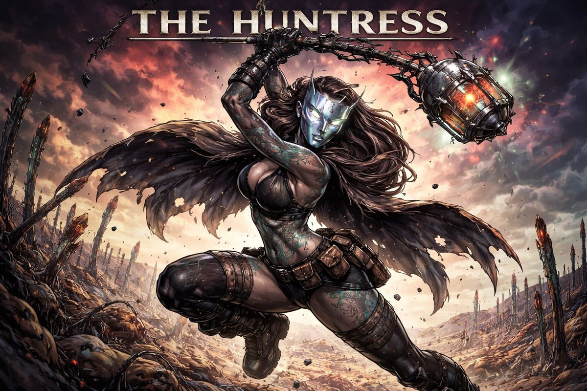 This 2D cartoon Disney-style digital art captures a detailed portrait of the Huntress in a harsh wasteland. She wears a sleek chrome mask and tattered cloak, leaping with a flail.