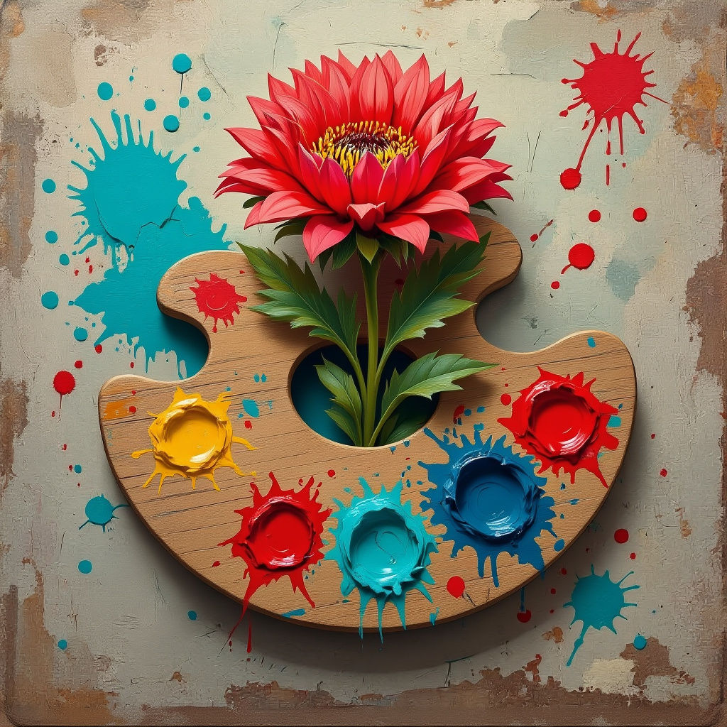 This image depicts a painter's palette from which an Indian Paint Brush flower grows in a whimsical style. The scene evokes a sense of creative expression.