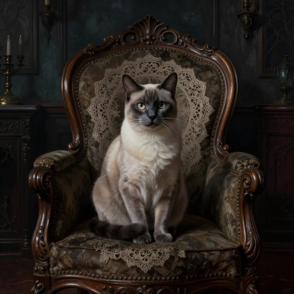 This image shows a majestic grey Siamese cat seated on an ornate armchair in a dimly lit Victorian Gothic room. Detailed digital painting style with atmospheric lighting and rich, dark colors.