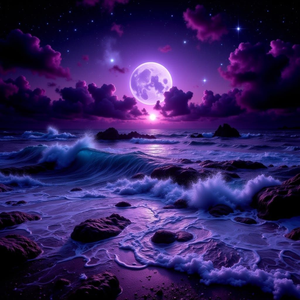 This image shows a serene, purple-toned night seascape with moonlit ocean waves washing onto a sandy beach. The scene features a neon grunge aesthetic, enhancing the nocturnal ambiance.