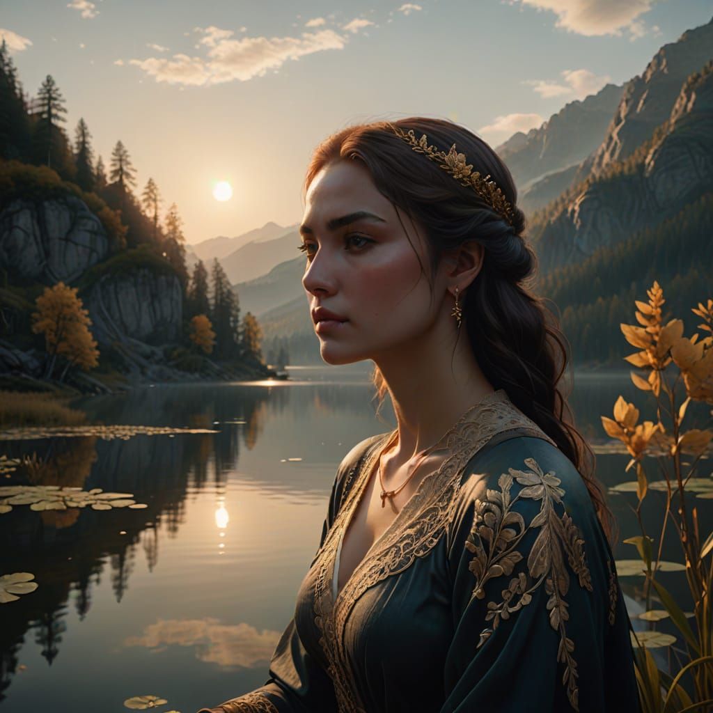 This captivating image features a young woman lost in thought, surrounded by soft, muted colors and subtle shadows. Soft light dances across her face, illuminating intricate patterns on her attire, as the mirror's surface ripples with a serene, lake-like quality.