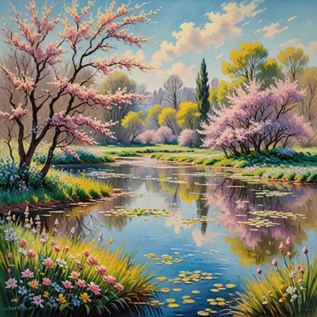 A serene spring landscape with blooming flowers and gentle water textures, rendered in soft pastel colors. This impressionist image captures warm sunlight with a soft focus.