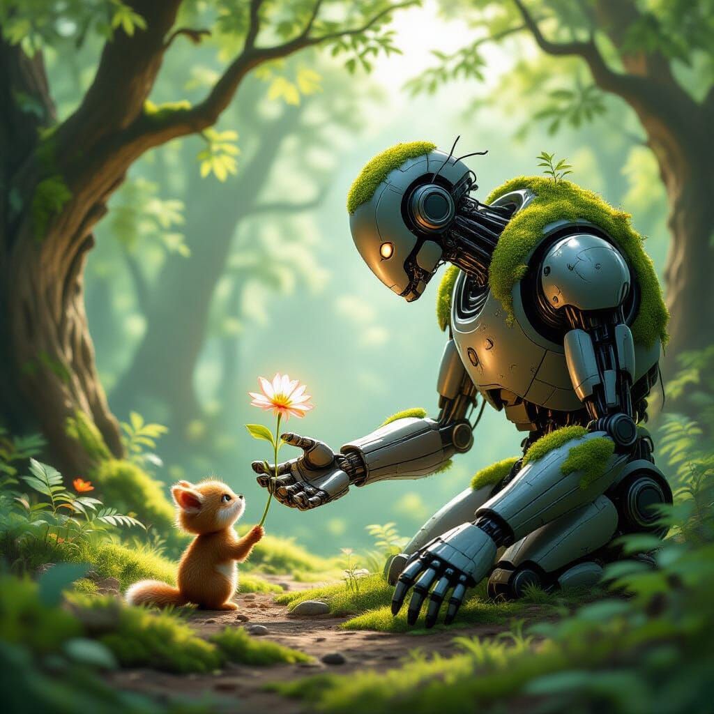 This image shows a large, moss-covered robot gently offering a luminous flower to a small, scared animal in a sunlit forest. It captures a tender moment of interspecies connection.