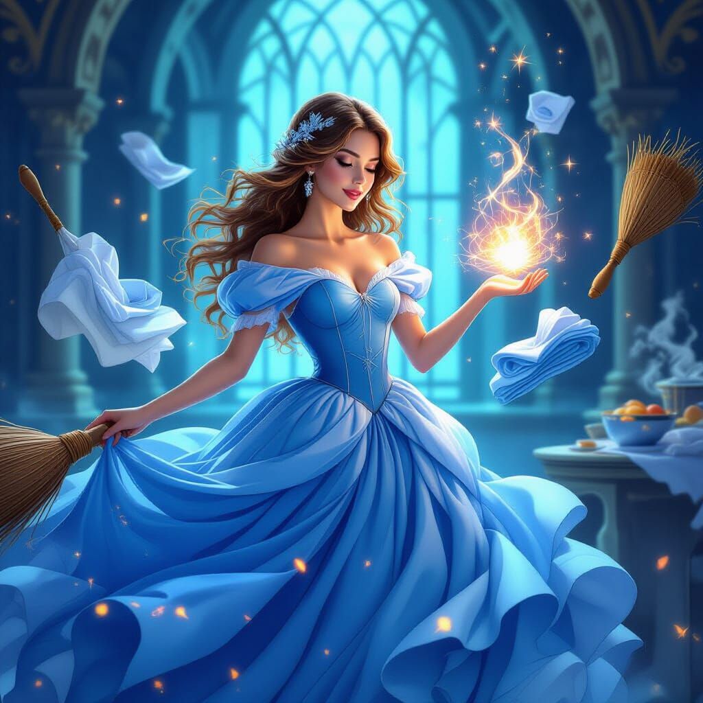 This image shows a princess in a blue dress in a castle, using magic for chores like cooking and laundry, with glowing energy. Digital painting style emphasizes flowing lines and an ethereal atmosphere.