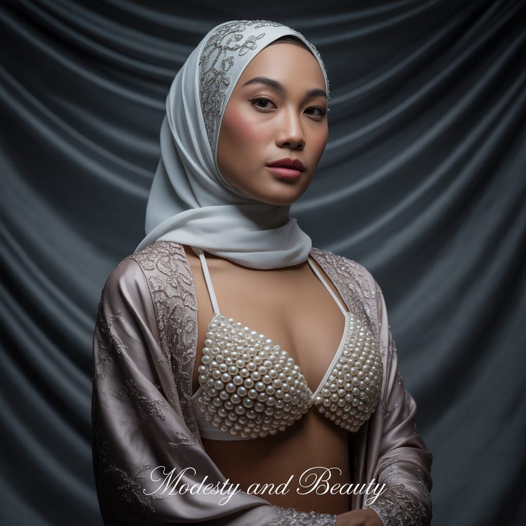 This image shows an Asian woman in a pearl bikini and embroidered hijab, posing in a studio setting. The portrait uses soft lighting against a charcoal backdrop to highlight the details and convey understated glamour.