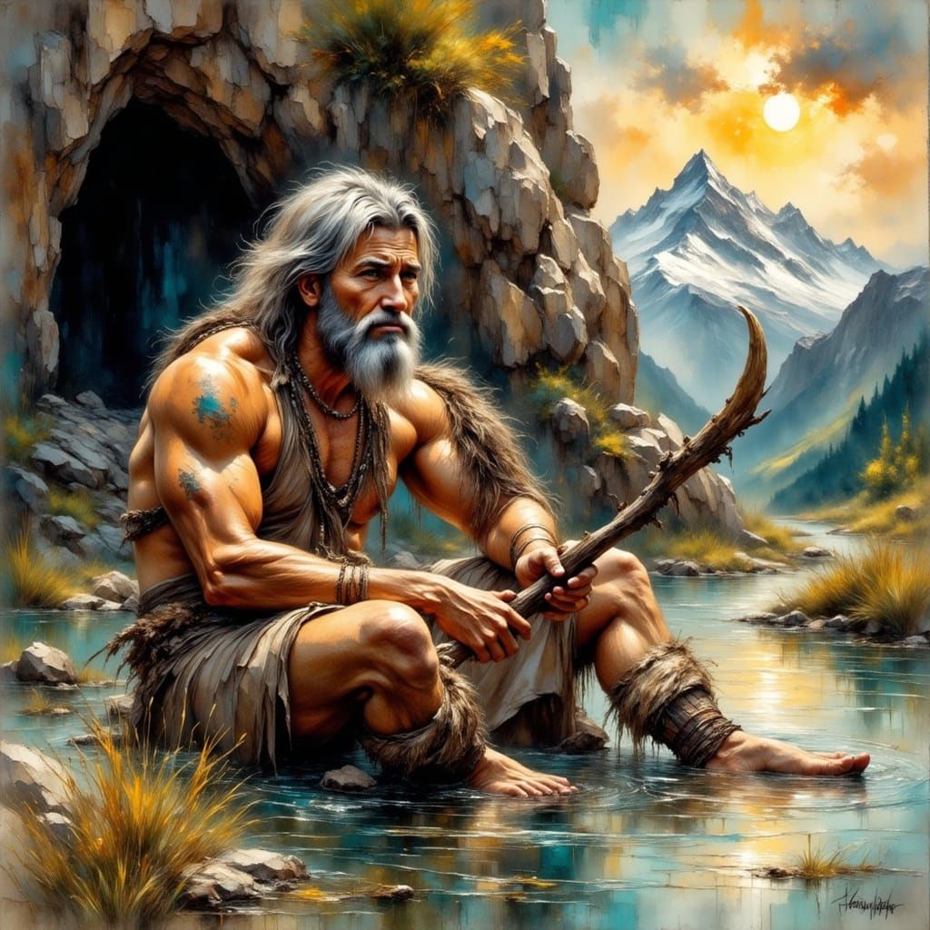This image shows a caveman riding a mammoth in shallow water. The scene is set against a backdrop of Rocky Mountains and a warm sunset, rendered in a textured, impressionist style with thick, expressive brushstrokes.