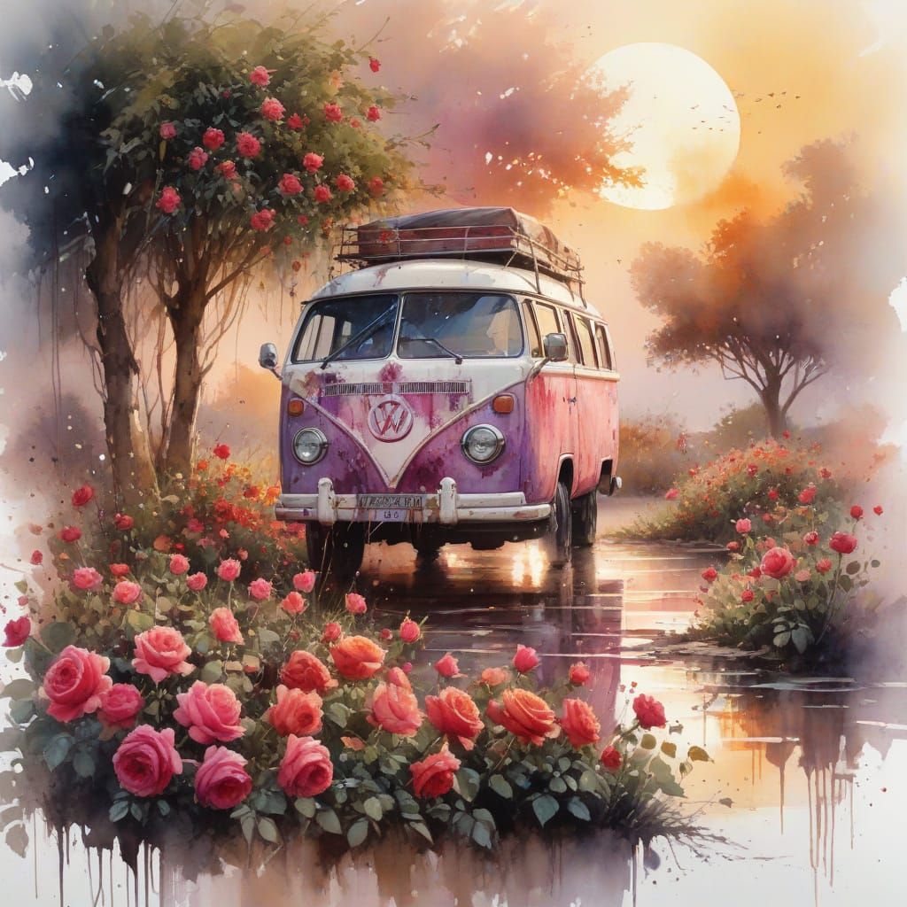 A picturesque image of a vintage campervan parked beside a rose garden as the sun sets. The sky is painted with magenta, orange, and violet hues. The artwork evokes a cinematic watercolor style.