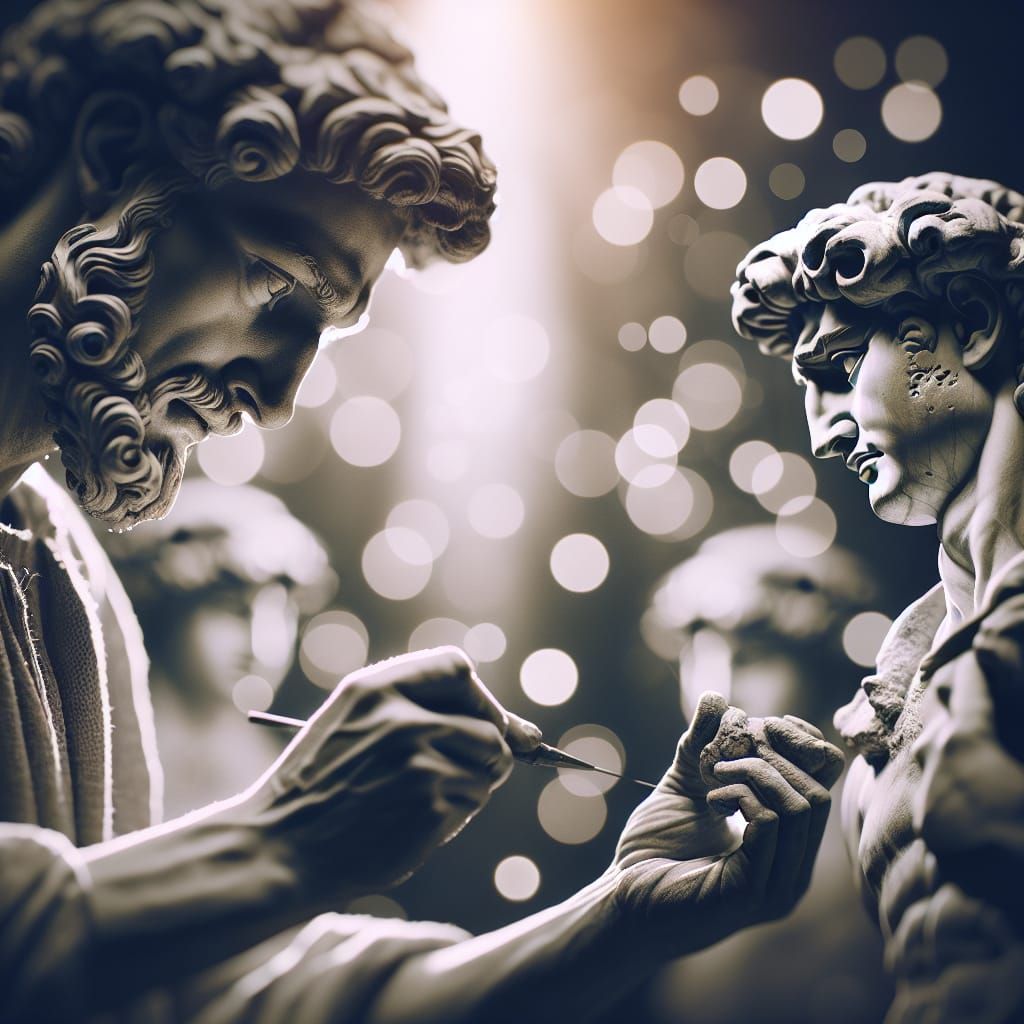 A close-up image of a Renaissance sculptor working on a statue similar to David. The artwork is illuminated with soft, professional studio lighting and captured in sharp focus, highlighting the sculptor's hands.