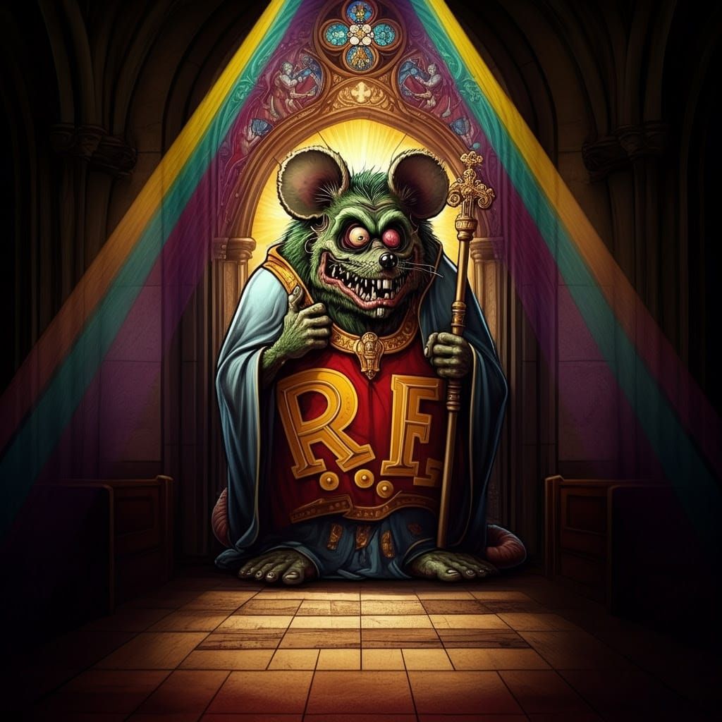 A stained-glass window shows the Rat Fink monster depicted as a saint. Rainbow light streams through the colored glass in this blend of religious iconography and lowbrow art, reminiscent of a medieval altarpiece.