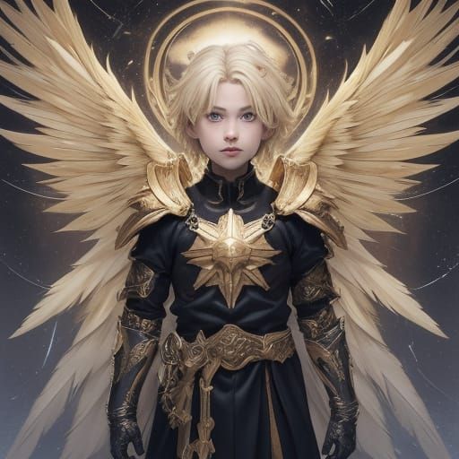 This image shows a blond child dressed as a fallen angel. The digital art depicts a sinister figure in gold armor with wide wings against a cosmic backdrop.