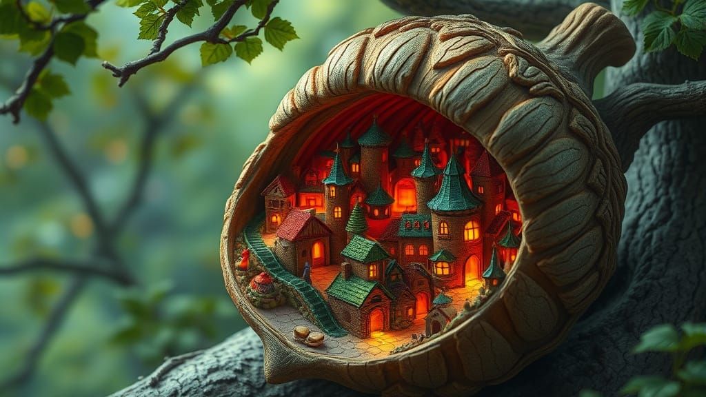 Build unique miniature city scenes inside acorns or any other object with our free and easy AI generator.