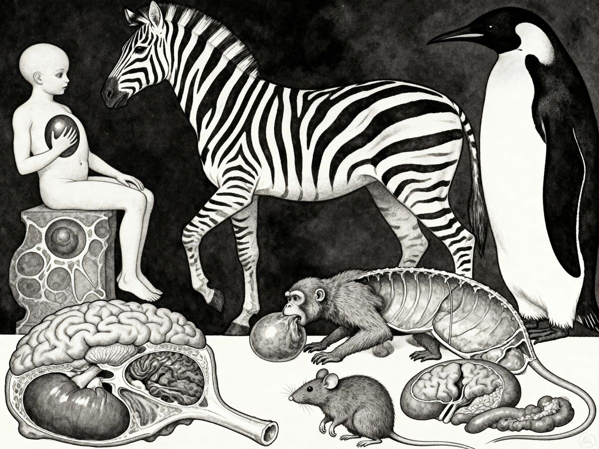 This image displays a bizarre and detailed anatomical study featuring a surreal blend of creatures and organs in a striking black and white palette, evoking a sense of mystery and unease.