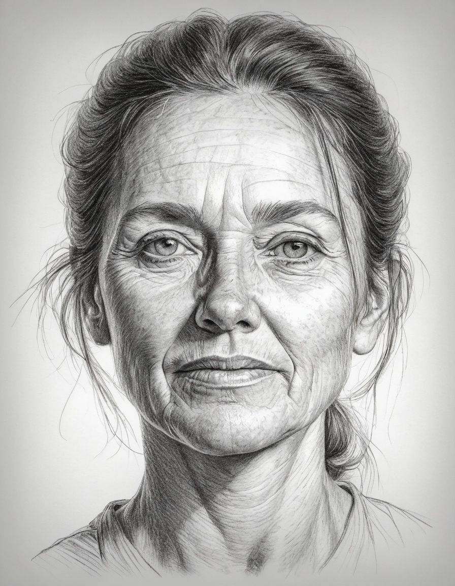 This image is a hyper-realistic graphite pencil sketch showcasing a 40-year-old woman with fine linework and soft shading. The natural expression is captured with soft lighting against a clean background.