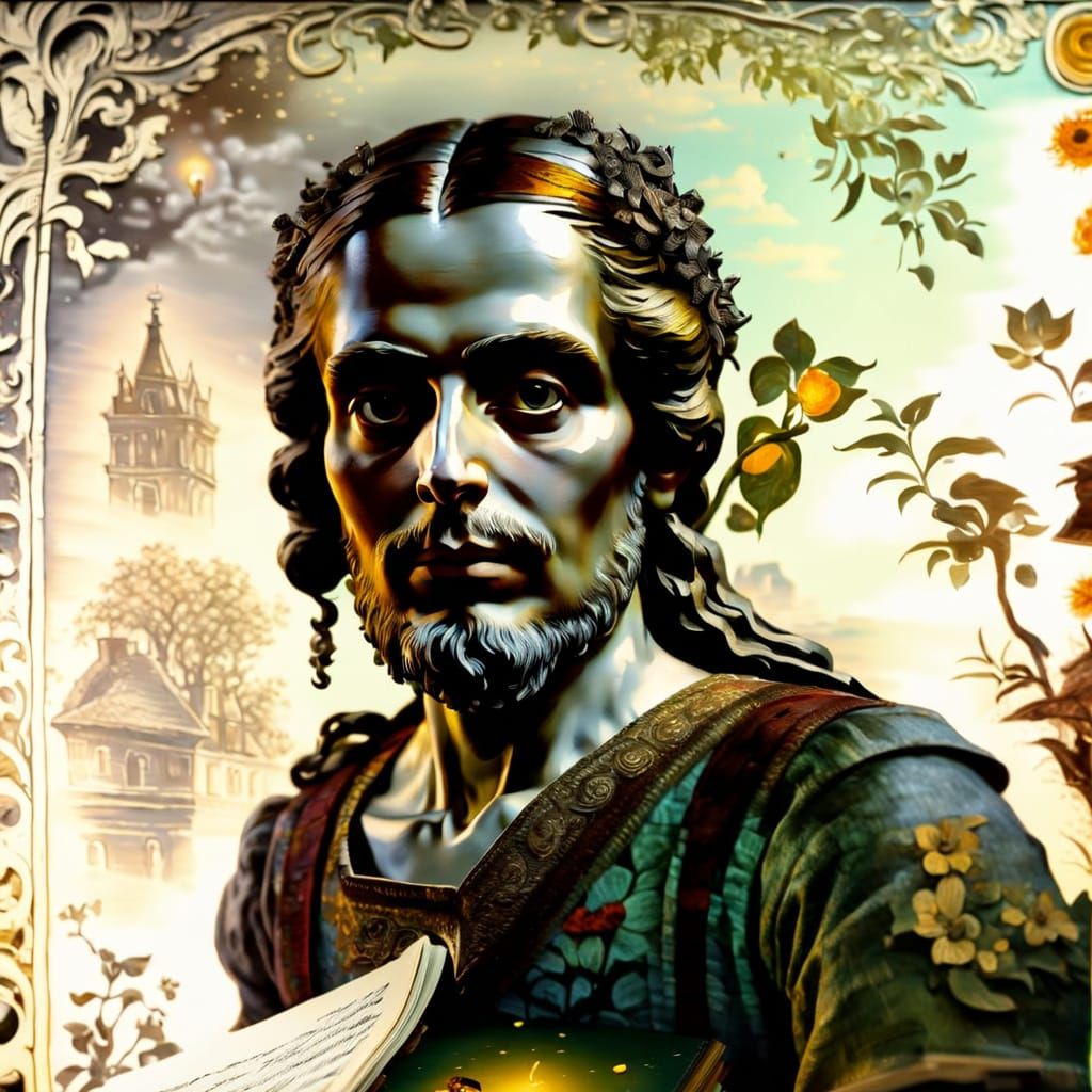 A striking image of a man writing in a book, illuminated by volumetric lighting. The artwork employs thick brushstrokes and vibrant textures with rich, earthy tones in a Van Gogh-inspired style.