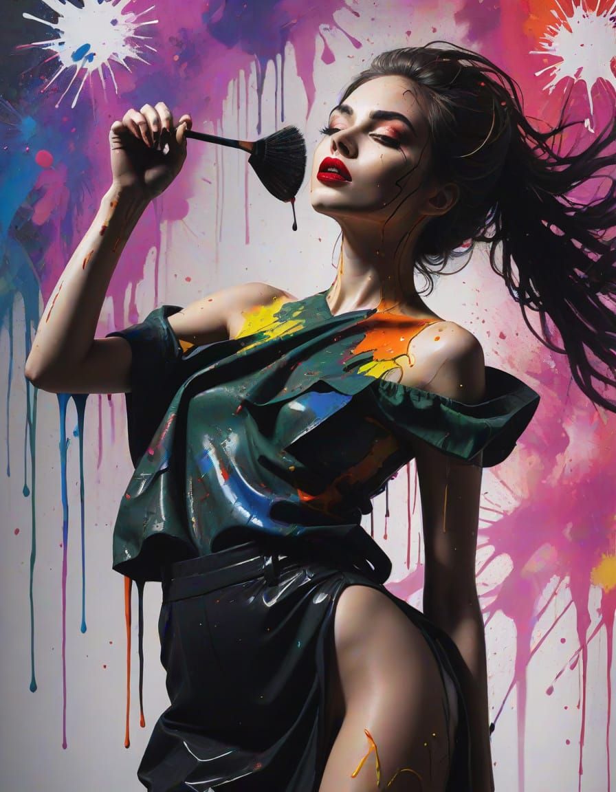 This image showcases a stunning, modern portrait of a woman with a dynamic, artistic hairstyle and a serene, melancholic expression. The vibrant colors and bold brushstrokes evoke a sense of energy and surreal quality, set against a dark background that enhances the subject's striking features.