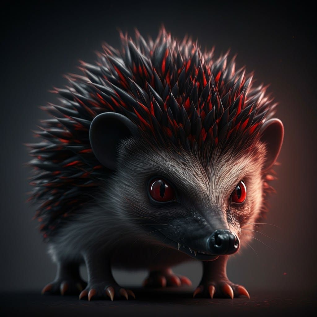 This image shows a menacing, hedgehog-like creature with dark skin and vibrant red eyes. Black and red spines cover its body, enhanced by dynamic lighting and ambient occlusion in a 3D rendered style.