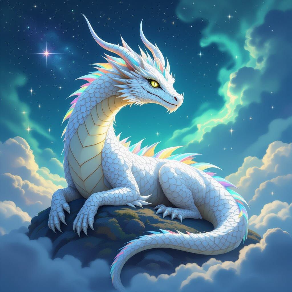 A stunning image of a white dragon with rainbow stripes guarding Earth. The dragon has silver scales and is surrounded by stars and green nebulae in a whimsical digital art style.
