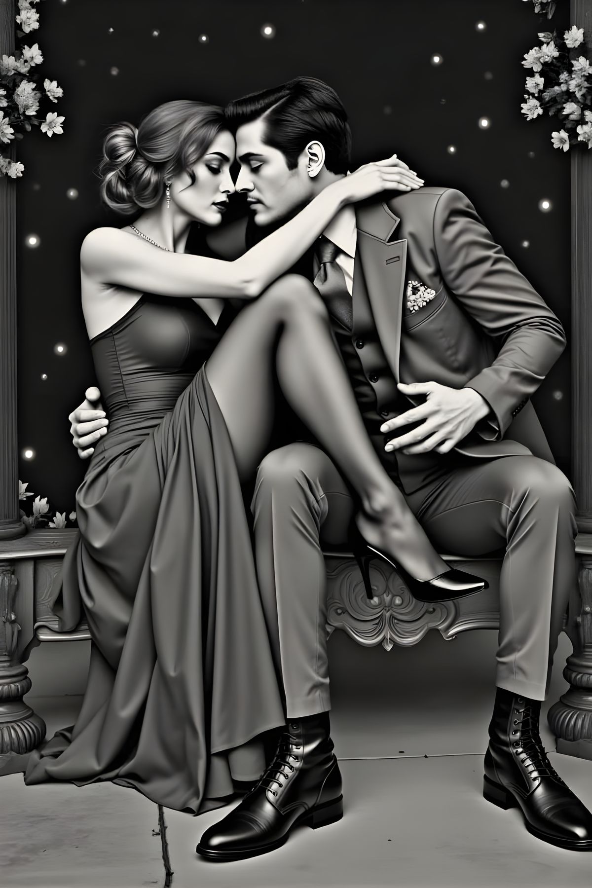A romantic painting capturing a couple in a loving embrace, rendered in the distinct visual style of 1930s cartoons.