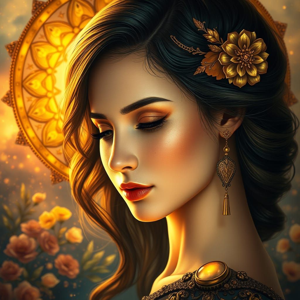 This stunning concept art piece features a woman with an affectionate expression, set against a vibrant, dreamlike background with intricate textures and triadic colors, evoking the essence of a trending Artstation splash art masterpiece in a captivating Art Nouveau style.