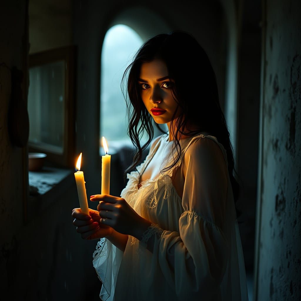 This image shows a hauntingly beautiful young woman in a ruined, gothic castle hallway, surrounded by decay and darkness, with cinematic lighting accentuating her mysterious and terror-filled eyes.