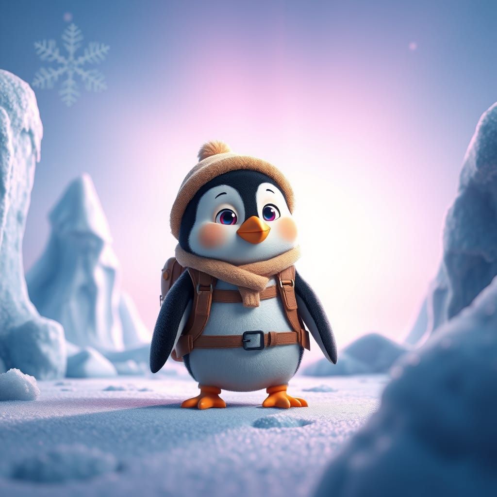 This image shows a charming penguin character standing in a fantastical, icy world with towering snowflakes and glittering icicles, set against a bright, radial gradient background, reminiscent of Pixar-inspired digital art with intricate textures and subtle lighting, evoking the imaginative world of Dis...