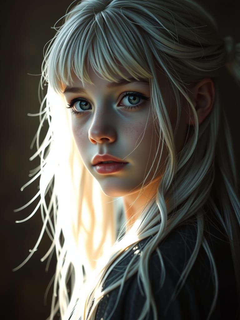 This image is a stunning, hyper-realistic portrait of a young woman with striking white hair, captured in a cinematic style with a shallow depth of field and subtle texture, evoking a sense of serenity and beauty.