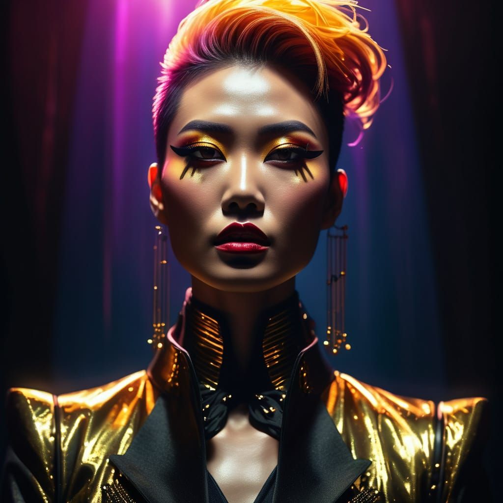 This close-up portrait of a Vietnamese androgynous cabaret commander showcases vivid colors and sharp contrasts, with glowing neon streaks in their hair and iridescent fabrics shimmering in the spotlight.
