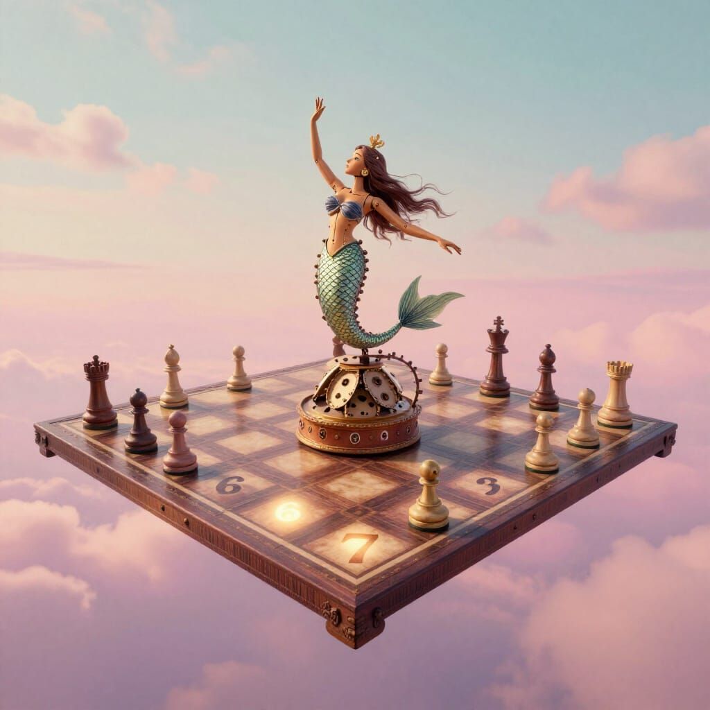 This image features a mechanical mermaid dancing on a giant, levitating chessboard under a dreamy, pastel sky. The scene has a symmetrical, vintage aesthetic.