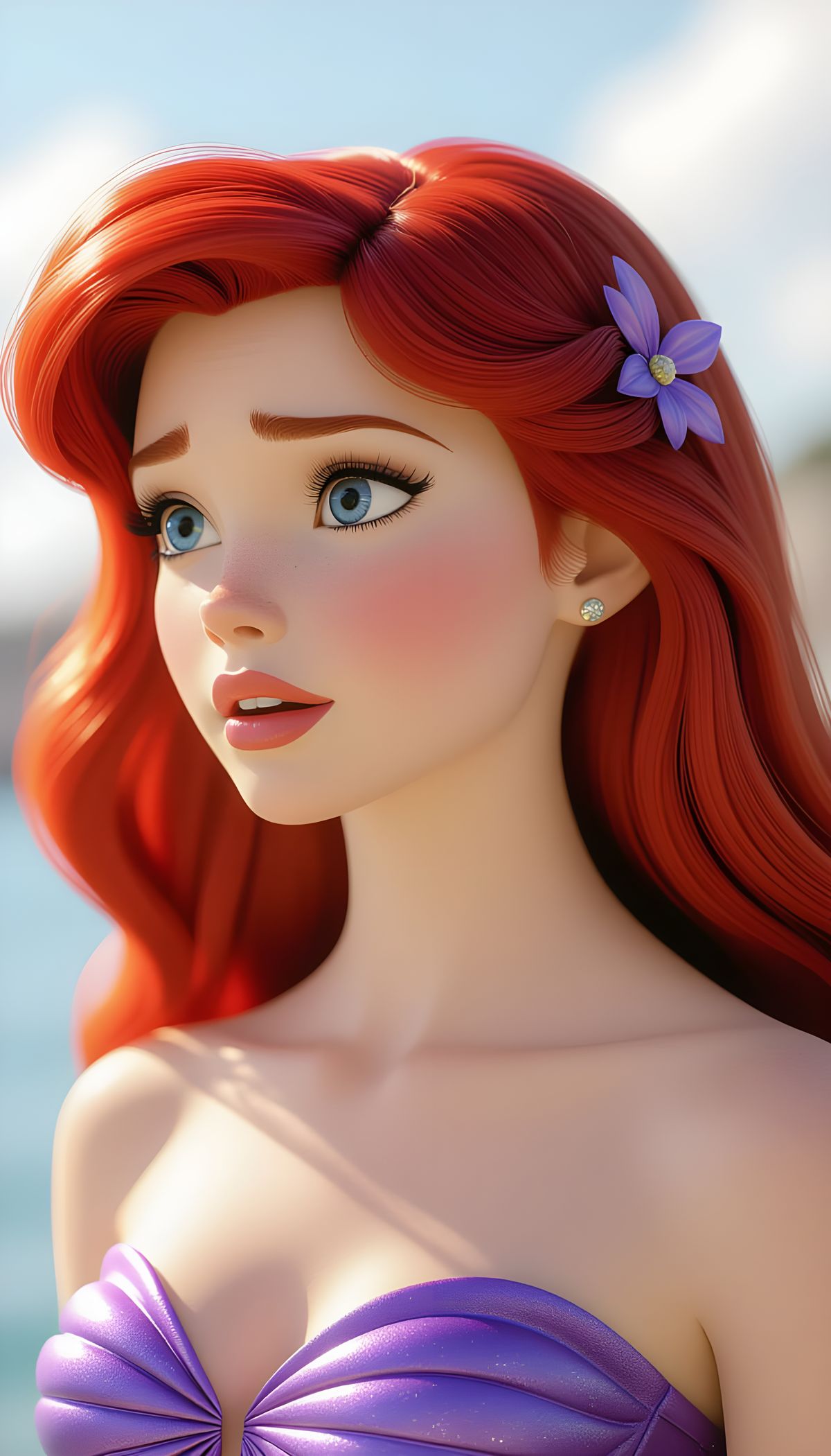 This image captures a hyper-detailed, ultra-realistic close-up portrait of Ariel in her iconic purple seashell bra. Rendered in a Pixar cinematic style with film grain and dramatic lighting.
