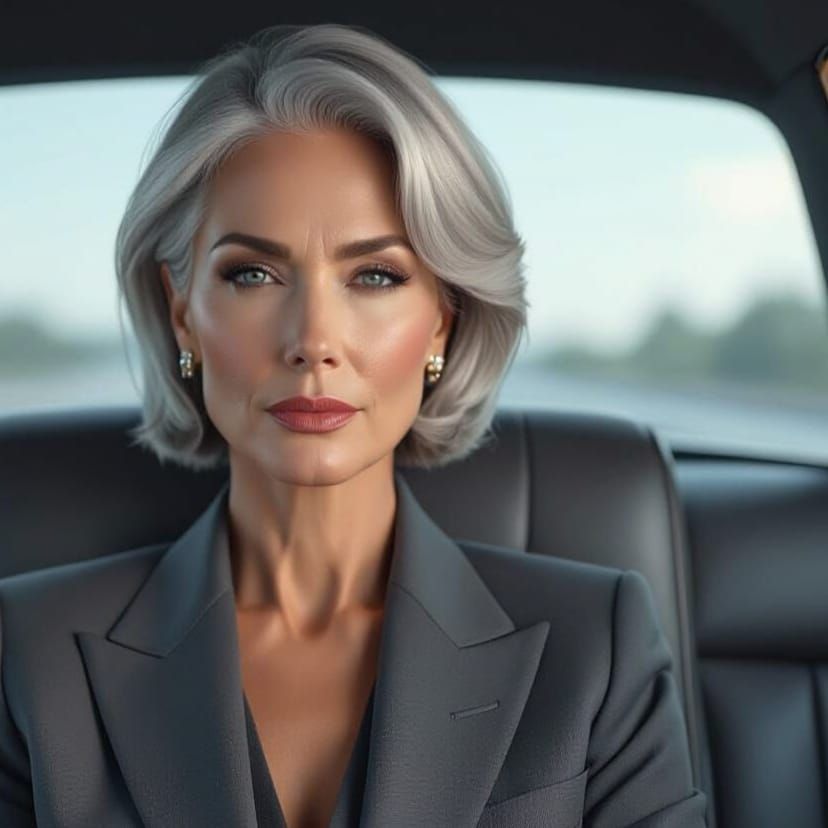 A stern, physically strong mature woman with short grey hair sits in a limousine. This detailed portrait captures her in a charcoal business suit with dynamic lighting.