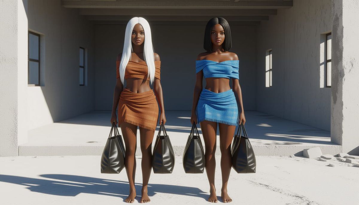This hyper-realistic image shows two young African women barefoot in an unfinished building at night, holding bags and looking fearful. Dramatic lighting and deep shadows create intense contrast.