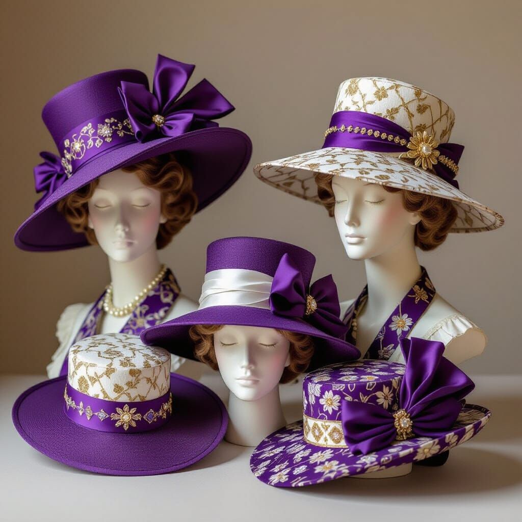 This image showcases hats meticulously crafted from suffragist fabrics in purple, white, and gold. The artwork highlights intricate textures and symbolic details, reminiscent of historical textile art.