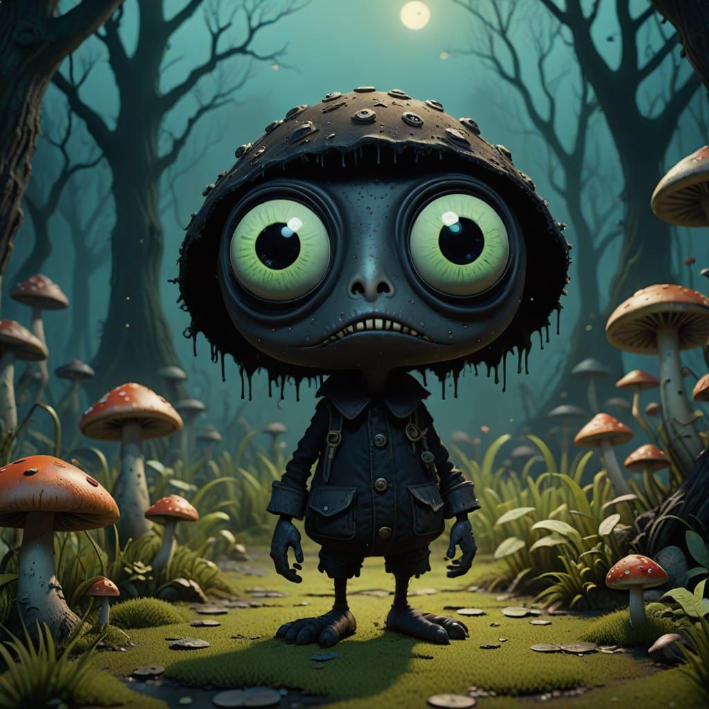This image depicts a whimsical creature in a dark, mystical setting, blending Tim Burton's signature style with vibrant colors and cinematic lighting.
