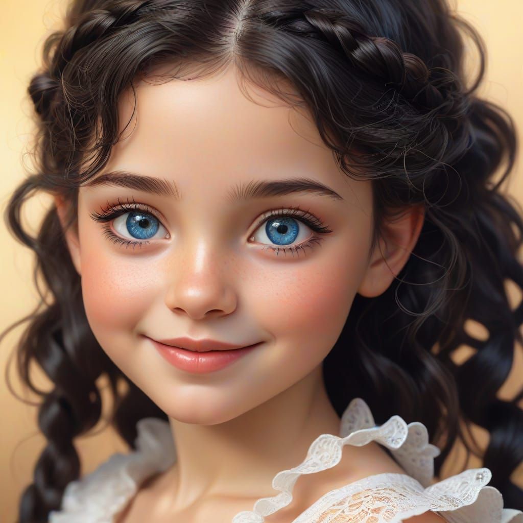 A close-up portrait of a smiling little girl with black wavy hair and a side braid. The artwork features vibrant orange hues, delicate lace details, and warm golden lighting as colored pencil art.