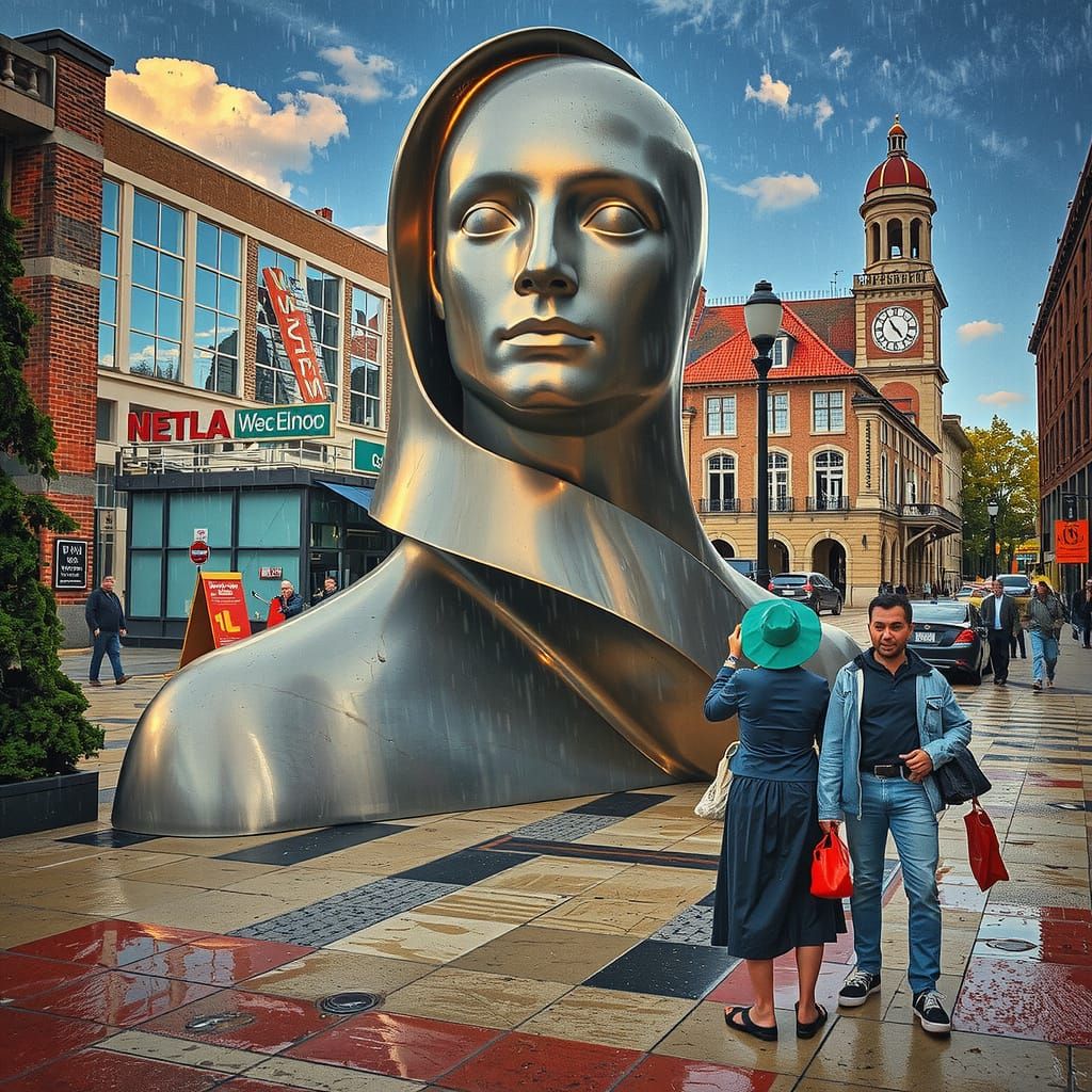 This image shows a polished stainless steel civic sculpture in an abstract style, set in a historic town square after a rain. The artwork is rendered with hyperrealism and photorealism.