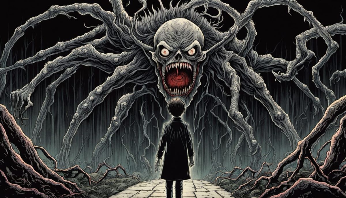 A haunting image of a shadowy figure trapped by a blade, surrounded by an aura of dread and foreboding, reminiscent of Japanese horror themes.
