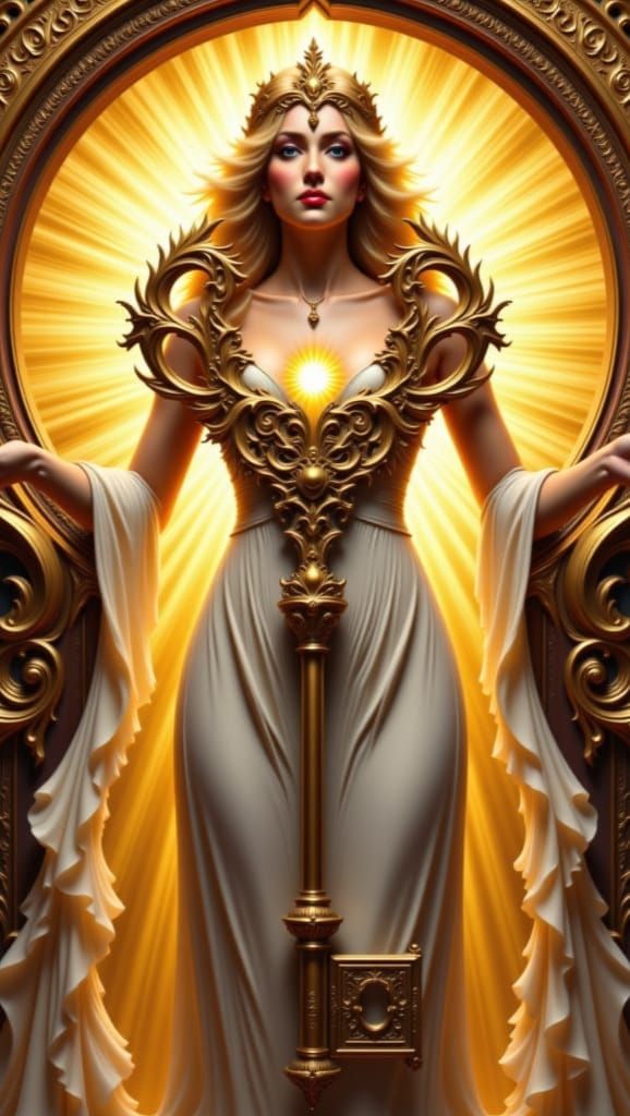 This image depicts the dawn goddess Aurora holding an ornate skeleton key, with sunbeams visible through a detailed keyhole, symbolizing the dawn of a new day.