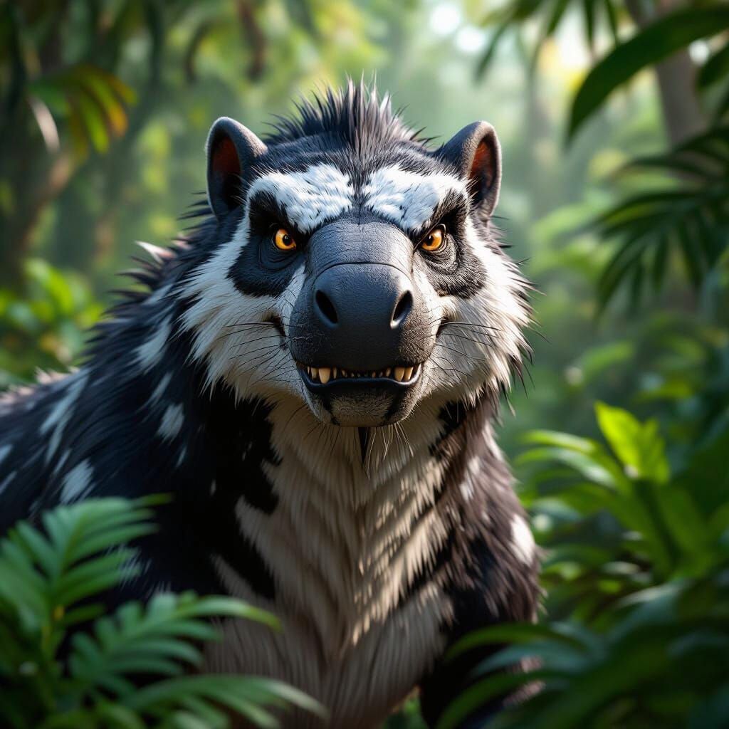 A highly detailed digital portrait of a prehistoric black and white Great Wolverine with a fierce expression, rendered in photographic quality using 3D rendering techniques. The image is composed as a medium close-up with a central composition and artificial side lighting that creates dramatic shadows ...