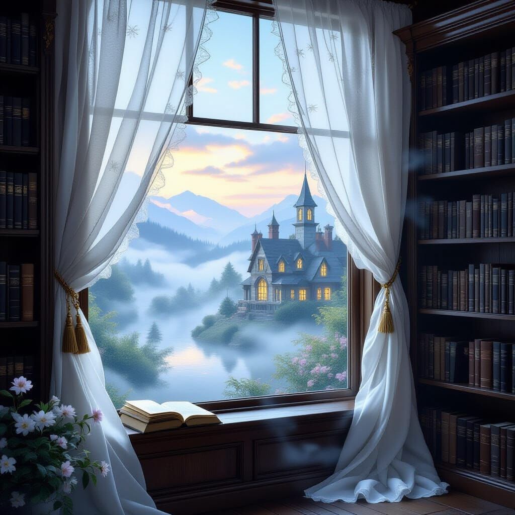 This image depicts a bookshelf and sheer curtains gently caught by an ethereal wind. It features hyperdetailed fantasy art with soft, glowing mist and luminous lighting, creating a dreamlike atmosphere.