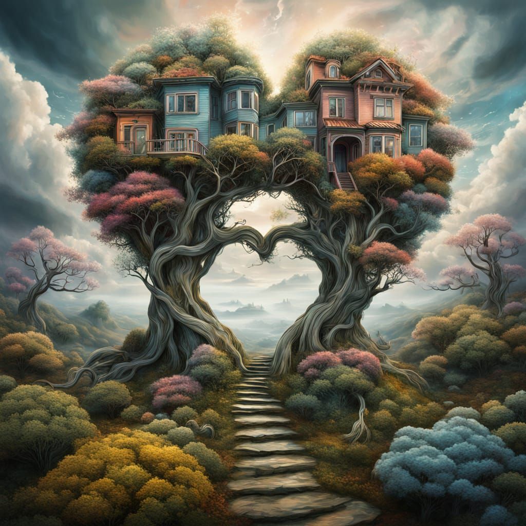This enchanting image depicts a dreamlike scene of a heart-shaped doorway within a cracked cloudscape, surrounded by twisted bonsai trees and cozy Victorian homes, set amidst a vibrant, swirling color palette and soft, diffused light.